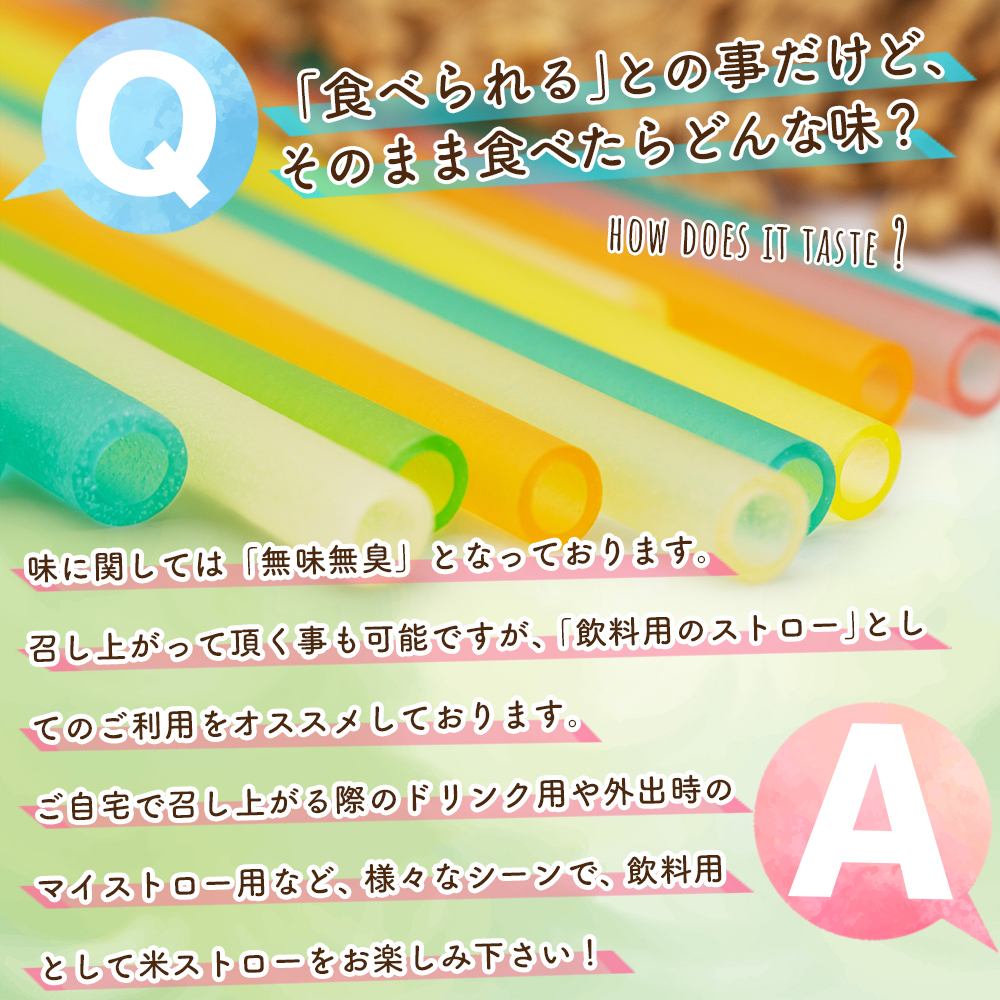 SNSや召し上がり方等で、米ストローをパスタや揚げ物などにして食べるシーンなどがございますが、米ストローはあくまでもストローでございますので、ご理解の程よろしくお願い申し上げます。