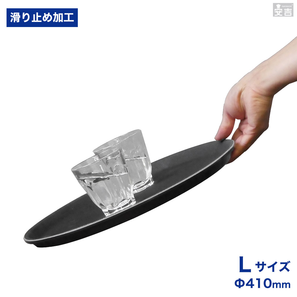 表面に「滑り止め加工」が施してあることで、飲食店でのサービスやキッチンからテーブルまでの持ち運びの際に載せた物がすべりにくく、とても便利なトレイです。