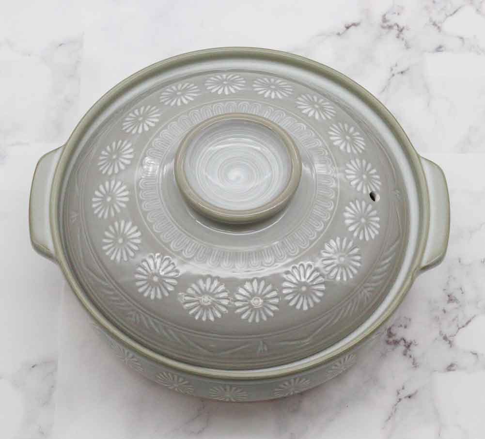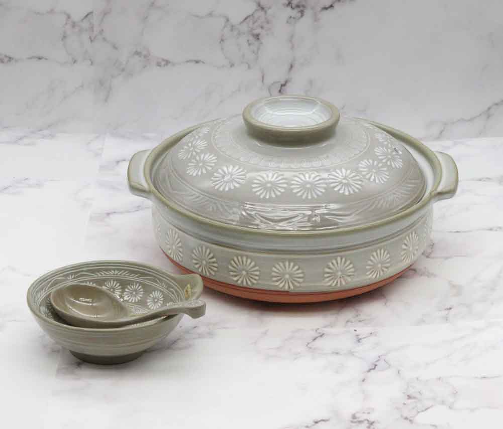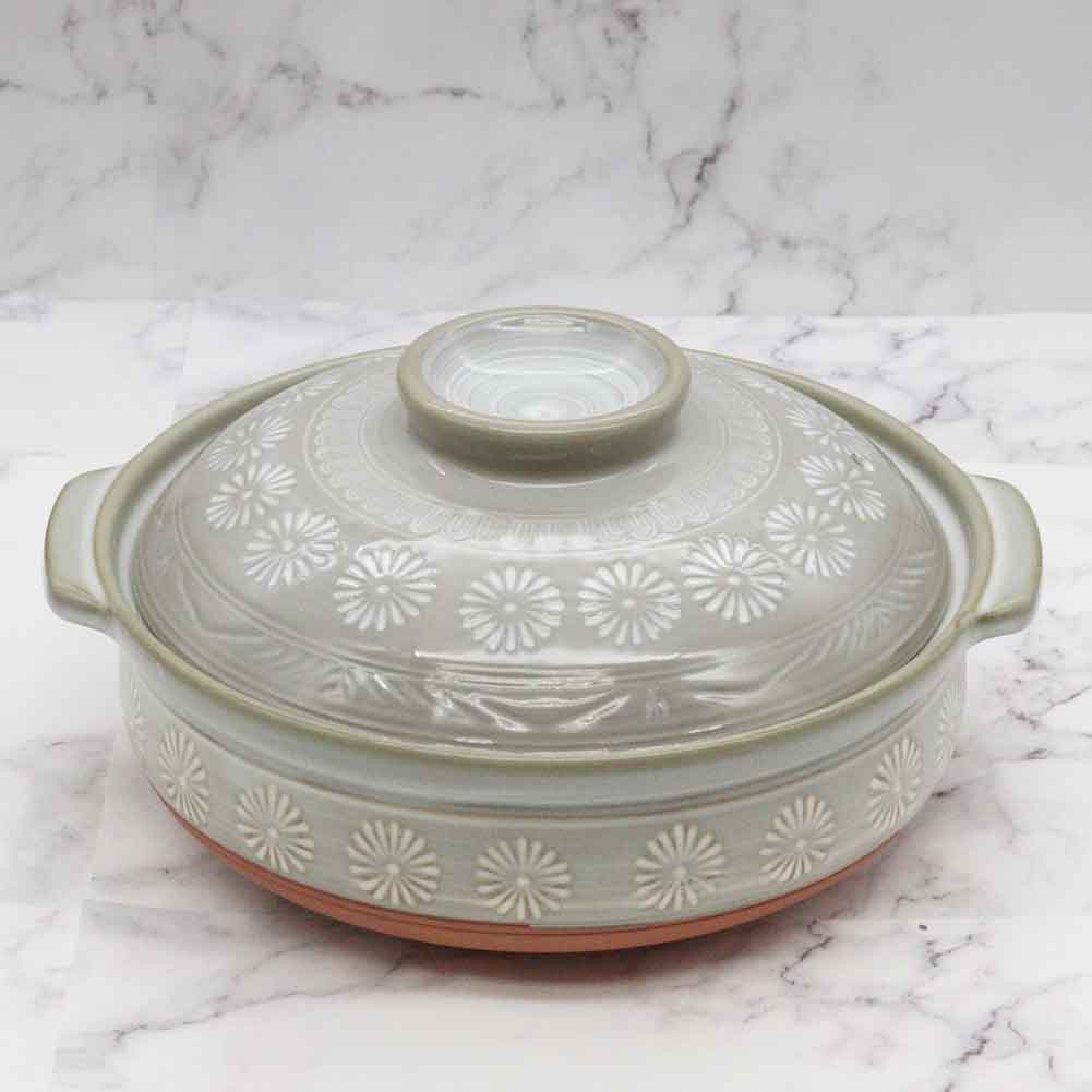 白とグレーの落ち着いたグラデーションに、大きく花の文様をあしらった日本の代表的な土鍋 花三島シリーズは、1970年代から続くロングセラーです。 プロの料理人から使われ始め、現在、国内外で幅広く愛され続けています。 料亭・レストランで、20年以上使われ続けても、損なうことのない機能性と耐久性が持ち味です。 絵付けは全て手作業で、絵付け職人自らが使用する刷毛を手作りし、自分の手に一番しっくりくるものを愛用しています。 約半世紀にわたって、人々に選ばれ続ける傑作です。 |
