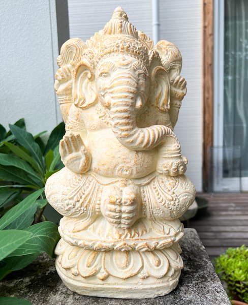 置き物 オブジェ 縁起物 ♪ガネーシャ像 背面バロン彫刻 アンティークホワイト(Mサイズ 35cm)♪ アジアン