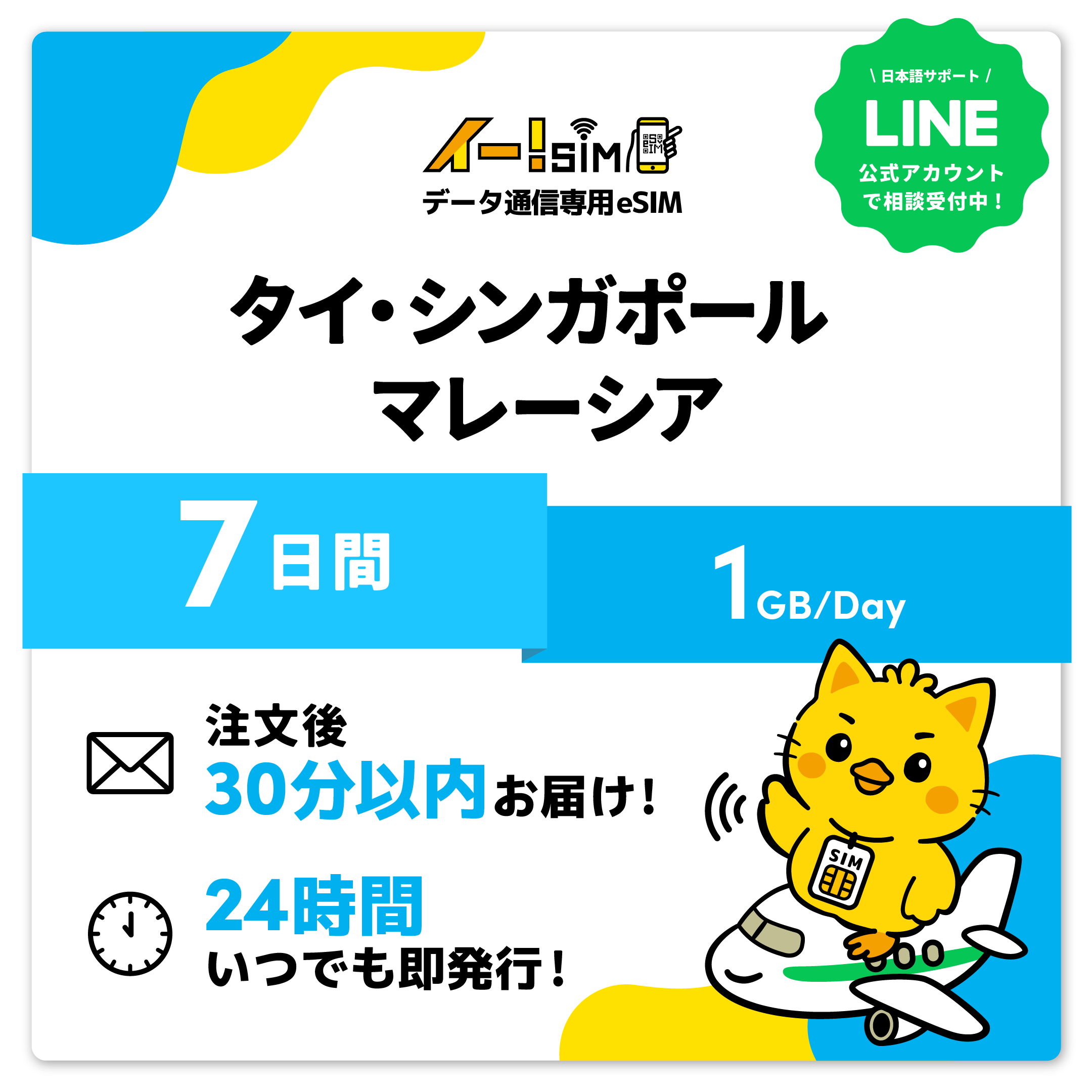タイ シンガポール マレーシア eSIM SIM 7日間 1日/1GB データ通信 プリペイドSIM イー!SIM