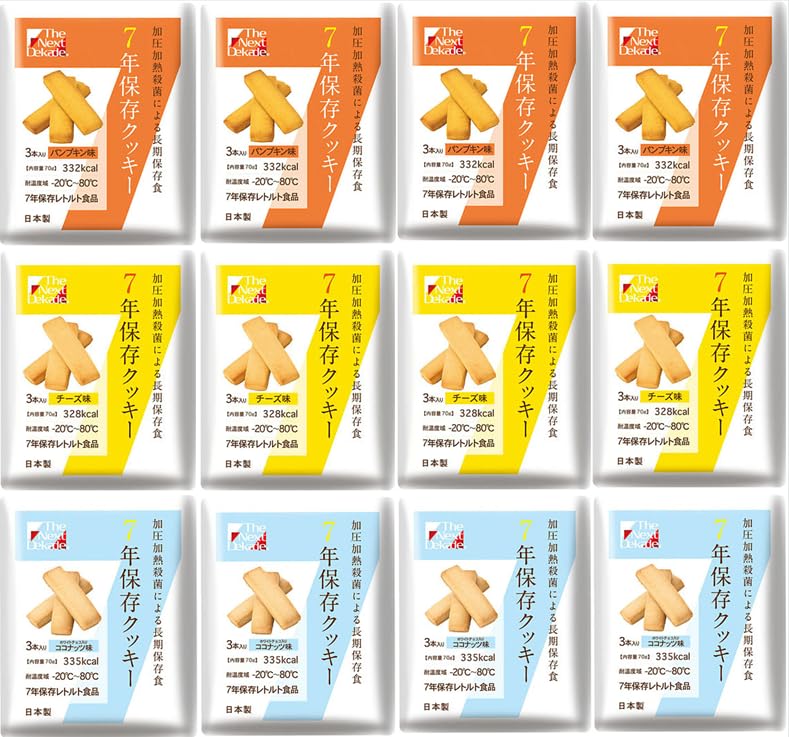 | 主な仕様 | 【セット内容】クッキー3種×4袋(計12袋):チーズ、ココナッツ、パンプキン ※耐温度域 : -20℃〜80℃【7年長期保存】本製品は7年間の超長期保存可能な商品のため災害用・緊急用の保存食、防災食としてご自宅や職場に常備するのもおすすめです。【インバウンド対応英語表記付き】商品パッケージは日本語と英語の2言語で表記。日本語が不自由な対してもそのままお渡しいただけます。チーズ味: 小麦粉(国内製造)、パン粉(小麦粉、糖類、その他)、マーガリン、砂糖、異性化液糖、ショートニング、ナチュラルチーズ、麦芽糖、水飴、鶏卵、食用卵殻粉/膨張剤、香料、着色料(カロチン)、ビタミンA、ビタミンD?、ビタミンE、ビタミンB?、ビタミンB?、ビタミンB??、ナイアシン、パントテン酸カルシウム、葉酸、ビタミンC、(一部に小麦・卵・乳成分・大豆を含む) パンプキン味: 小麦粉(国内製造)、マーガリン、砂糖、パン粉(小麦粉、糖類、その他)、異性化液糖、パンプキンパウダー、水飴、鶏卵、全粉乳、ショートニング、食用卵殻粉/香料、膨張剤、着色料(カロチン)、ビタミンA、ビタミンD?、ビタミンE、ビタミンB?、ビタミンB?、ビタミンB??、ナイアシン、パントテン酸カルシウム、葉酸、ビタミンC、(一部に小麦・卵・乳成分・大豆を含む) ココナッツ味: 小麦粉(国内製造)、パン粉(小麦粉、糖類、その他)、マーガリン、砂糖、異性化液糖、ココナッツミルクパウダー、ホワイトチョコレート、水飴、鶏卵、食用卵殻粉/膨張剤、香料、ビタミンA、ビタミンD?、ビタミンE、ビタミンB?、ビタミンB?、ビタミンB??、ナイアシン、パントテン酸カルシウム、葉酸、ビタミンC、(一部に小麦・卵・乳成分・大豆を含む)直射日光を避けて常温で保存してください (但し、本製品は-20℃以上80℃以下の環境にも耐えられます)※耐温度域 : -20℃〜80℃ |