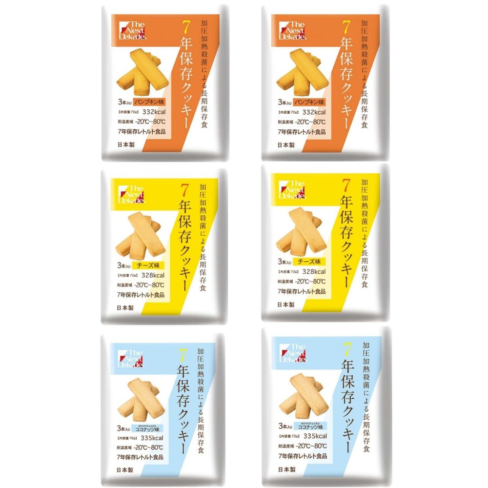 | 主な仕様 | 【セット内容】クッキー3種×2袋(計6袋):チーズ、ココナッツ、パンプキン ※耐温度域 : -20℃〜80℃【7年長期保存】本製品は7年間の超長期保存可能な商品のため災害用・緊急用の保存食、防災食としてご自宅や職場に常備するのもおすすめです。【インバウンド対応英語表記付き】商品パッケージは日本語と英語の2言語で表記。日本語が不自由な対してもそのままお渡しいただけます。チーズ味: 小麦粉(国内製造)、パン粉(小麦粉、糖類、その他)、マーガリン、砂糖、異性化液糖、ショートニング、ナチュラルチーズ、麦芽糖、水飴、鶏卵、食用卵殻粉/膨張剤、香料、着色料(カロチン)、ビタミンA、ビタミンD?、ビタミンE、ビタミンB?、ビタミンB?、ビタミンB??、ナイアシン、パントテン酸カルシウム、葉酸、ビタミンC、(一部に小麦・卵・乳成分・大豆を含む) パンプキン味: 小麦粉(国内製造)、マーガリン、砂糖、パン粉(小麦粉、糖類、その他)、異性化液糖、パンプキンパウダー、水飴、鶏卵、全粉乳、ショートニング、食用卵殻粉/香料、膨張剤、着色料(カロチン)、ビタミンA、ビタミンD?、ビタミンE、ビタミンB?、ビタミンB?、ビタミンB??、ナイアシン、パントテン酸カルシウム、葉酸、ビタミンC、(一部に小麦・卵・乳成分・大豆を含む) ココナッツ味: 小麦粉(国内製造)、パン粉(小麦粉、糖類、その他)、マーガリン、砂糖、異性化液糖、ココナッツミルクパウダー、ホワイトチョコレート、水飴、鶏卵、食用卵殻粉/膨張剤、香料、ビタミンA、ビタミンD?、ビタミンE、ビタミンB?、ビタミンB?、ビタミンB??、ナイアシン、パントテン酸カルシウム、葉酸、ビタミンC、(一部に小麦・卵・乳成分・大豆を含む)直射日光を避けて常温で保存してください (但し、本製品は-20℃以上80℃以下の環境にも耐えられます)※耐温度域 : -20℃〜80℃ |