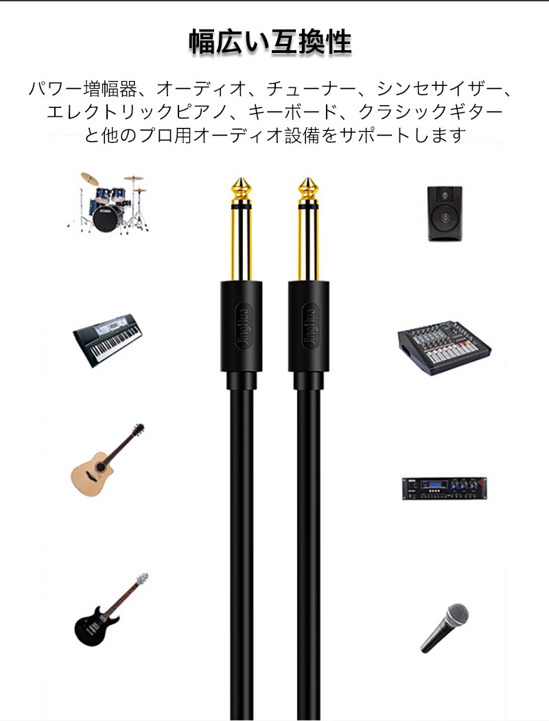 φ6.35(6.5)ジャックを搭載したギターやベースなどの電子楽器をアンプなどに接続して音声を伝送できるモノラルケーブルです。
