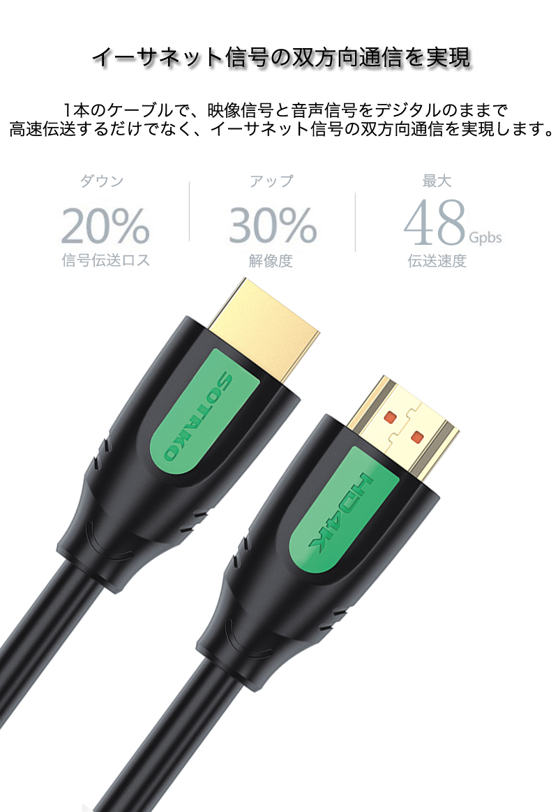 映像信号と音声信号に加え、48Gbpsのイーサネット通信を実現する、4K/60Hz、3DフルHDに対応した、イーサネット対応HIGH SPEED HDMIケーブル。