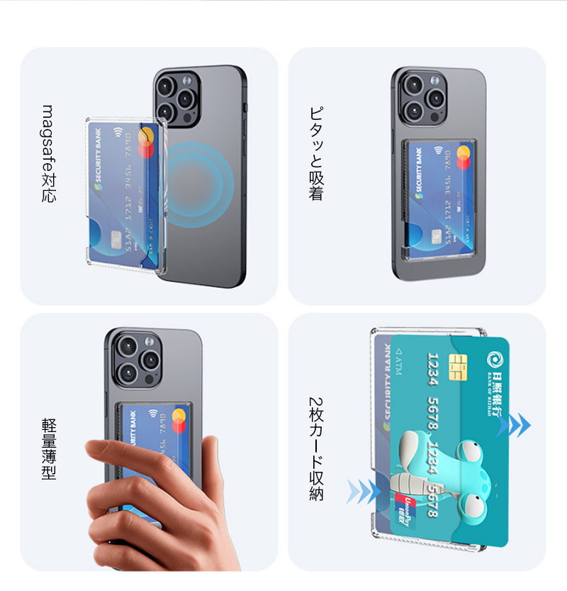 Magsafeカードケース クリア MagSafe対応 カードポケット カード2枚収納可能 iphone 16 15 14 13 12 pro max マグセーフカードポケット メタルプレート付き