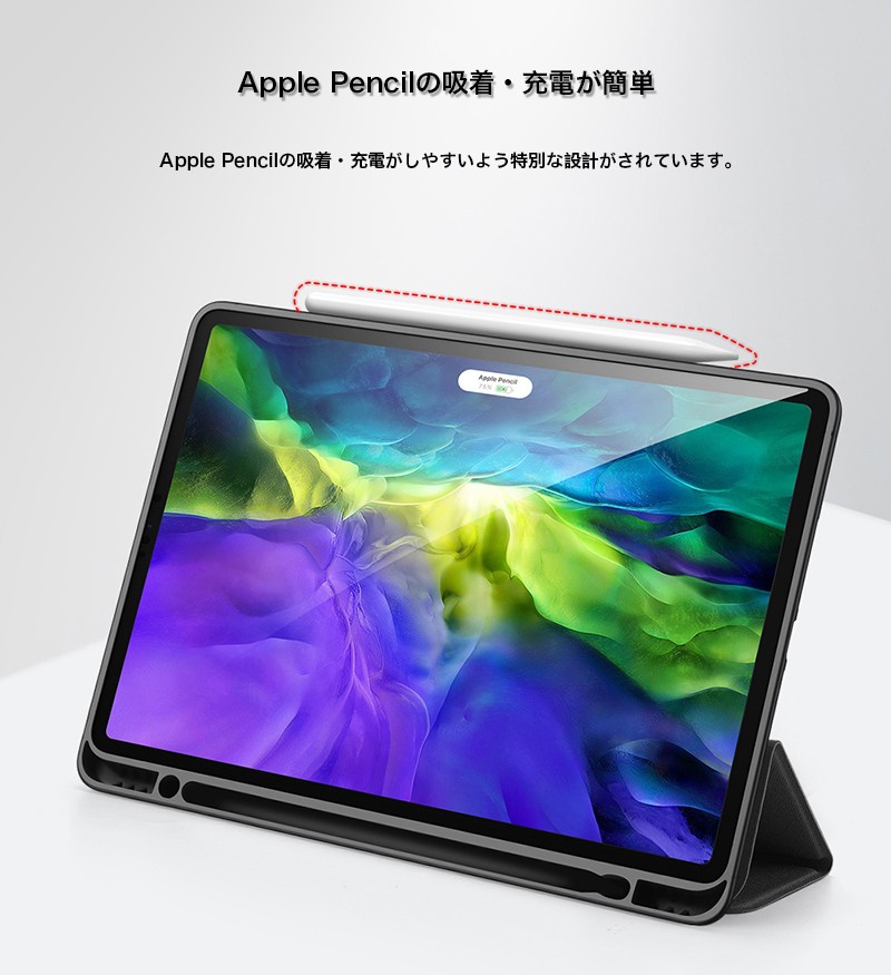 新しいApple Pencilの吸着・充電機能に対応して、PUレザー製フロントカバーとポリカーボネート製ケースがひとつになった、スタンド機能つきケース。