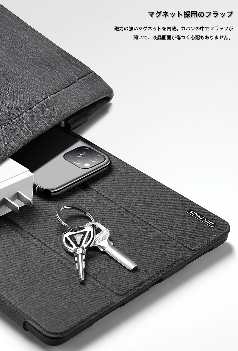 磁力の強いマグネットを内蔵。カバンの中でフラップが開いて、液晶画面が傷つく心配もありません。