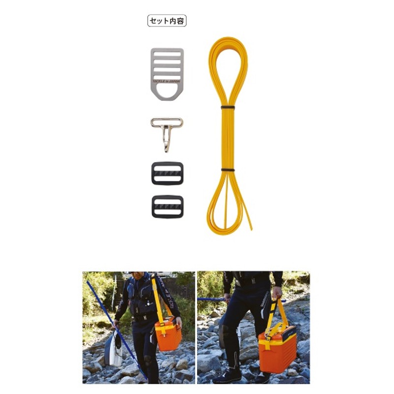 お手持ちの鮎カンのベルトと取り替え使用。肩掛け←→手提げ時とベルトの長さが瞬時に切替え可能。鮎カンの持ち運びが楽になります。