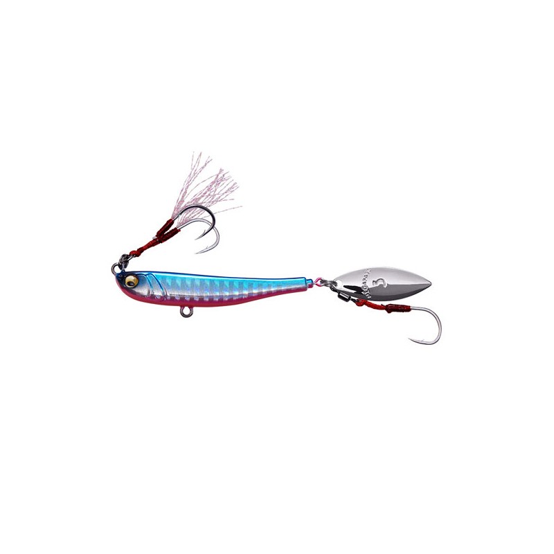 【魚種限定解除。誰でも簡単! 様々な魚種に対応!キャスティング・ブレードジグ】マキッパはその名の通り、投げて巻くだけの新感覚キャスティング・ブレードジグ。ソルトウォーターシーンにおいて、キャスティングジグは飛距離性能と多様な魚種に有効なことから定番のルアーとなっていますが、思い描いたアクションを出すのが難しかったり、狙ったレンジをキープしづらかったりと、使うには慣れや経験が必要なルアーといえます。マキッパは、キャスティングジグの使いにくさをカバーし、誰もが簡単に扱えるよう、徹底チューンを施しました。テールには巻くだけで集魚効果の高いブレードを装着し、さらにブレードの回転を阻害せずにブレードバイトを高確率でフックアップ可能な、ブレードフックシステム(PAT.)を搭載。計算されたボディバランスと各パーツの配置により、ボディが回転することなく安定したスイミング&フラッシングでターゲットを誘います。使い方は着水後、即リーリングすれば表層を、沈めてからリーリングすれば中層やボトム付近をレンジキープするため、ターゲットの泳層に合わせた攻略ができます。あらゆる魚種に効果的なティンセル付きアシストフックを標準装備しており、また腹部に設けたおまかせアイにより、好みに合わせてダブル、トリプルフックなどを追加装着可能です。特にボトムからバイトしてくる魚には、おまかせアイへのフック装着が効果的。対象魚は、シーバス、ヒラメ、マゴチ、ブリ(イナダ、ワラサ)、サワラ、カンパチ、アジ、サバ、タチウオ、マダイ、クロダイ、根魚類と、多種多様なターゲット。マキッパを貴方のソルトウォーター釣行に常備すれば、あらゆる釣り場で活躍してくれることでしょう。【対象魚】シーバス、ヒラメ、マゴチ、サワラ、カンパチ、ブリ(イナダ、ワラサ)、アジ、サバ、タチウオ、マダイ、クロダイ、キビレ、根魚類 etc...【おまかせアイ】状況に合わせてダブルフック、トリプルフックなど装着可能な「おまかせアイ」を搭載。お好みに合わせてチューンナップが可能!※当製品にはトリプルフックは付属されておりません。【ブレードフックシステム (PAT.)】ブレードバイトを超高確率でフックアップ! [ライトSW メタルジグ ブレードジグ]【スペック】・サイズ(g):30・カラー:ブルーピンク・フックサイズ:#12・ブレードサイズ:#3
