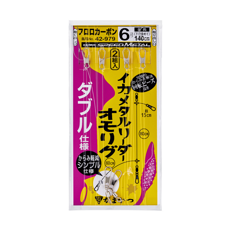 オモリグリーダーにダブルタイプが登場金属パーツの使用を極力控え、シンプルな構成にすることにより、絡みによるトラブル軽減を実現しました。6号ハリスを使用することで潮馴染みが良く、イカのアタリをクリアに感じることが可能です。バーティカルに攻めるベイトオモリグに最適な仕掛寸法となっており、上段にはドロッパー、下段にはエギを装着することで最も威力を発揮します。Gamakatsuがまかつ イカメタルリーダー オモリグダブル●品 番:42-979●ハリス:6●幹 糸:6●全 長:140cm(下枝含む)●入 数:2組
