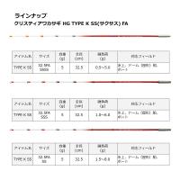クリスティア穂先HG(ハイグレード)に、新ラインアップ「千島の胴調子(PA:パラボリック アクション)、久保田の先調子(FA:ファスト アクション)」クリスティア2大看板、千島克也(TYPE C)テスターと久保田稔テスター(TYPE K)監修の「HGシリーズ」の新シリーズ従来、千島テスターのTYPE-Cは先調子、久保田テスターのTYPE-Kは胴調子でしたが、彼らも状況に応じた穂先の使い分けをしています。●ガイドにダイワテクノロジー、「サクサス」メッキを施することで、表面硬度も上がり、耐久性・耐磨耗性アップ●穂先最先端部のガイトスレッドは、よりアタリの見やすい、蛍光オレンジを採用。 (以降のガイドスレッドは従来通り、調子毎に色を変えています。)TYPE K SS FA(ファストアクション):32.5cm SSSS●最先端は非常にしなやかで小さなアタリもしっかり取れ、穂持ちで乗せる。 バットは負荷によってクッションを効かせながらバラシを防いでくれる。●誘っている時は8:2調子→乗せる時は7:3→巻き上げ時は6:4と負荷によって調子がギアチェンジしていく独特な「7:3変則ギア調子」DAIWA CRYSTIAWAKASAGI HG SS FAダイワ クリスティアワカサギ HG SS FA●アイテム名:TYPE K●サイズ:32.5FA SSSS●自重(g):約5●全長(cm):32.5●鉛負荷(g):0.5〜5.0●対応フィールド:ドーム(屋形)船、ボート、氷上