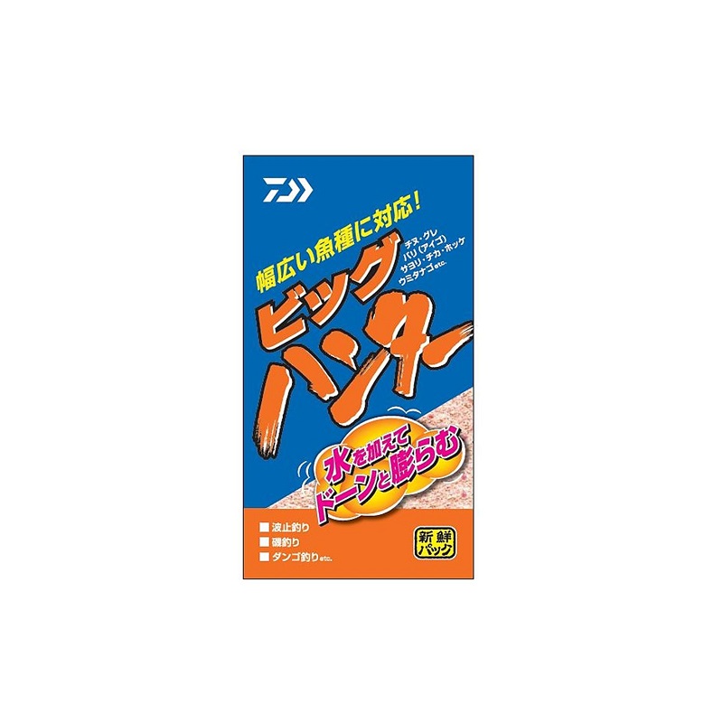 水を加えてボリュームアップ 多魚種に対応!水を加えてボリュームアップ。波止・磯・ダンゴ釣り等のベースエサに。比重はやや軽めで、チヌグレをはじめ多魚種に対応。鮮度を保つ新鮮パック。低酸素状態でパックされ、酸化を防ぐ。空気を抜いてパッケージするから大容量なのにコンパクト。(その他機能)・新鮮パック集魚力を劣化させる酸素・紫外線をシャットアウト。作りたてのニオイ・味はそのままにコンパクトにパッケージ。持ち運び便利で良く釣れる。釣果にこだわった結果として行き着いた「新鮮パック」(製品詳細)水を加えると大きく膨らみ、たっぷりと使用できる満足感。DAIWA BIG HUNTERダイワ ビッグハンター25