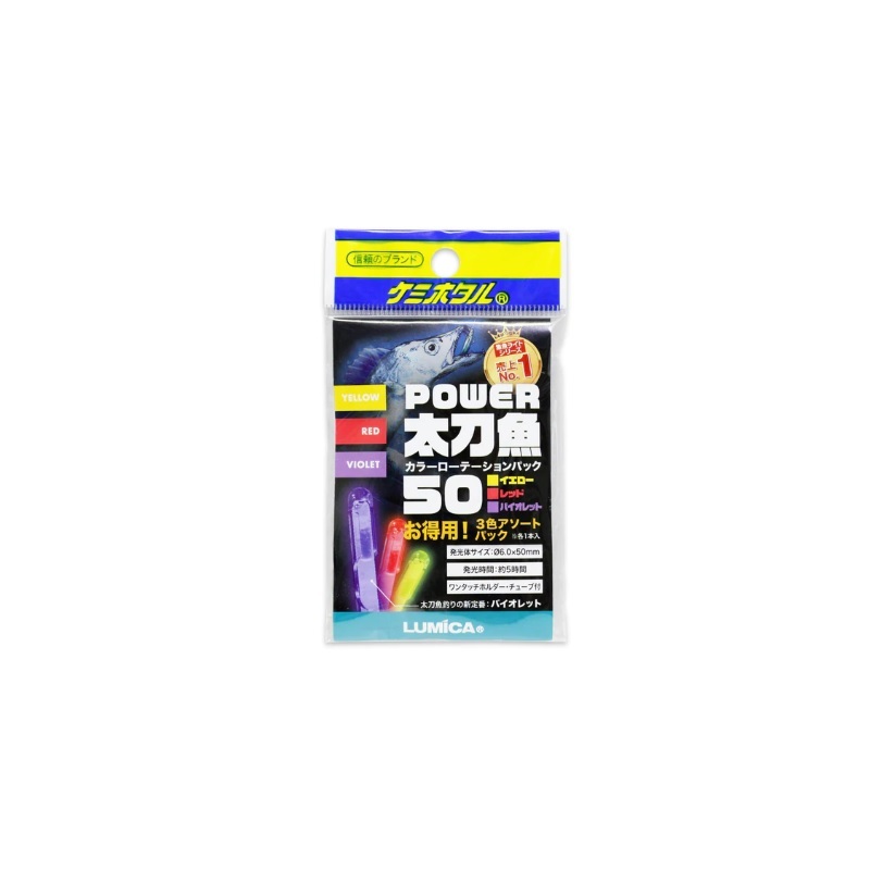 太刀魚釣りの必需品「パワー太刀魚」シリーズに1パック3色入りのお買い得品カラーローテーションパックが登場!パック内にイエロー・レッド・バイオレットが1本ずつ入っているので、状況に合わせた使い分け・投げ分けにも便利。※バイオレットは本パック限定カラーとなります。バイオレットカラー単体の販売はございません。※ご使用の際は発光体を軽く曲げて、全体が光る様に振ってからご使用下さい。※同じ箇所を何度も曲げたり、強く曲げ過ぎないで下さい。内部の発光液が漏れる事が有ります。LUMICAルミカ パワー太刀魚 カラーローテーションパック●内容物:パワー太刀魚×3本 ワンタッチホルダー×1組 専用アタッチチューブ×1組※1袋ずつ個包装されています。●サイズ:50●本体サイズ:直径6.0mm×50mm●重量:1.35g●カラーラインナップ:イエロー/レッド/バイオレット●発光時間:約6時間●仕様:使い切りタイプ