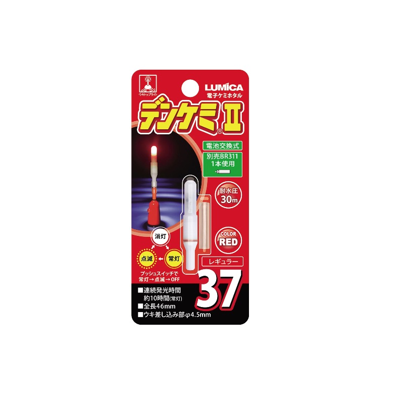 LED式ウキトップライトの決定版!視認性抜群の電子版ケミホタル。LED式ウキトップライト「デンケミ」の電池交換タイプが登場!更に使い易くなったウキトップライトの決定版。お手持ちのケミホタル対応ウキにそのままセット可能。専用チューブで仕掛けに取り付けて簡易的な水中集魚ライトにも!※仕掛けにセットして使用する場合は、スナップに引っ掛けるだけで使用出来る 「ぶらぶライト37・50 スプリング」がお手軽です。 (ぶらぶライトシリーズは37・50サイズのみとなります。75サイズはございません)【ご使用方法】対応のリチウム電池を本体にセットし、パッキンが見えなくなるまで電池ケースをしっかりと締め込んでからご使用下さい。■対応電池・37サイズ→BR311×1個(別売)・50サイズ→BR425×1個(別売)・75サイズ→BR435×1個(別売)その後、本体のプッシュスイッチを押して点灯させて下さい。常灯モードの状態で再度スイッチを押すと点滅モードに切り替わり、その状態で再度スイッチを押すと消灯します。※ウキトップとして使用する際はウキサイズを事前にご確認下さい。※耐水圧は水深30mまでとなります。30mを超える水深でのご使用はお控え下さい。※対応電池は別売となります。LUMICAルミカ デンケミ2●内容物: デンケミ本体×1個 取付用チューブ×1個●カラー:レッド●サイズ:37サイズ 本体(Φ7.6mm×46mm) ウキ差し込み部(Φ4.5mm)●重量:1.3グラム●連続点灯時間:レッド(約10時間)●耐水圧:30m●対応電池:ピン電池 BR311×1個●点灯方法:点灯→点滅→オフ→点灯(以下、繰り返し)※対応電池は別売となります。
