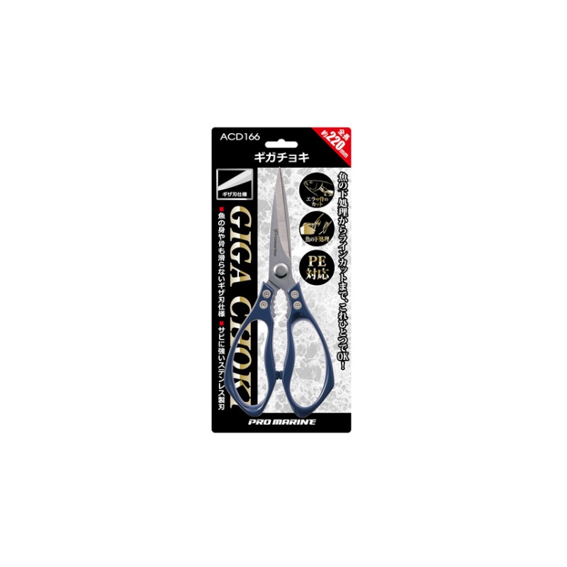 魚の下処理から、エラ・ヒレのカット、ラインカットまでこれ一つでOK!超万能大型ハサミHAMADASHOKAI浜田商会 ACD166 ギガチョキ●サイズ:220mm●カラー:ネイビー●材質:ステンレス