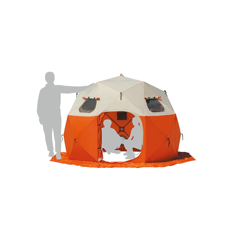 強度のあるグラスファイバーフレームをクロスさせた正方形が12面集まり、8角形のドーム型テントとなっています。