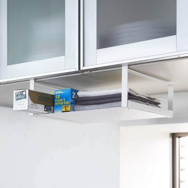 キッチンの吊り戸棚に差し込んで使用する収納ラック。
