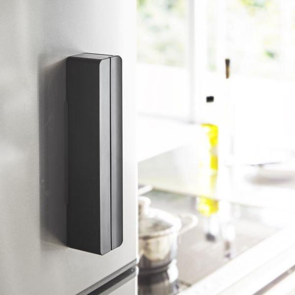 マグネット入り。 冷蔵庫横などに貼り付けて収納できます。