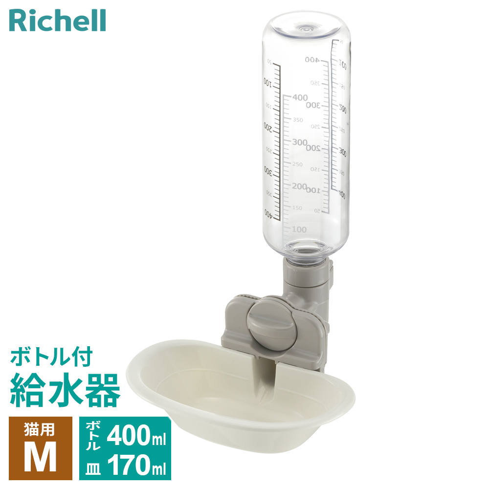 ケージ・サークルに取り付けて使用する、ボトル付きのお皿型の給水器【猫用/Mサイズ】。