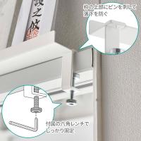 枠の上部にピン(針)で刺し込んで落下を防ぎ、付属の六角レンチを使って調節ネジで枠にしっかり固定できます。