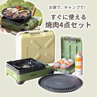 屋外での使用に特化した風防付きカセットコンロと、焼肉プレートと、純正カセットガス、カセットボンベケースのセット。