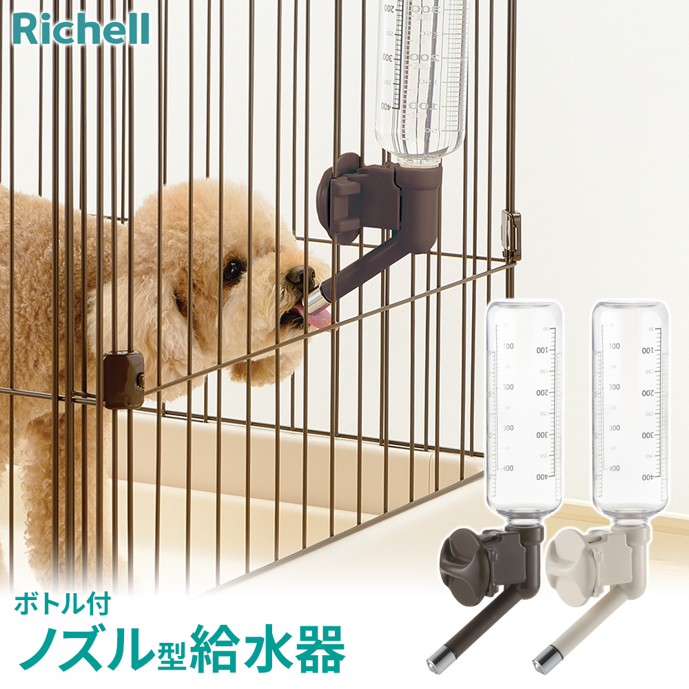 ケージ・サークルに取り付けて使用する、ボトル付きのノズルタイプの給水器。