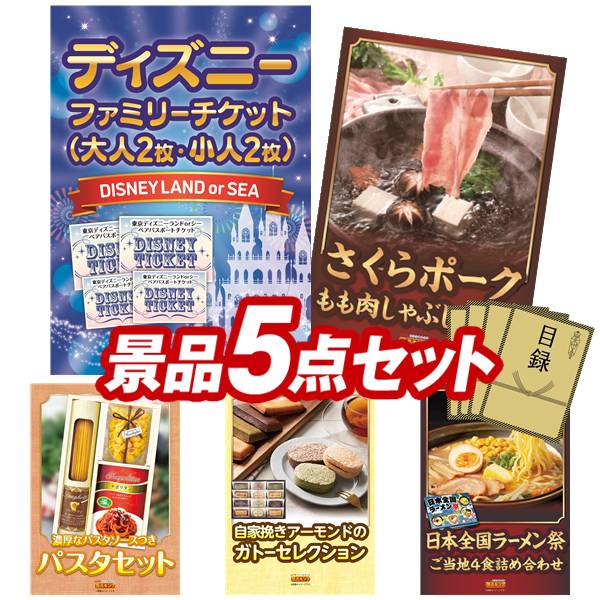忘年会 景品セット 5点 結婚式二次会 ゴルフコンペ イベント パーティーにも最適!目玉はディズニーファミリーチケット(大人2枚 小人2枚)!