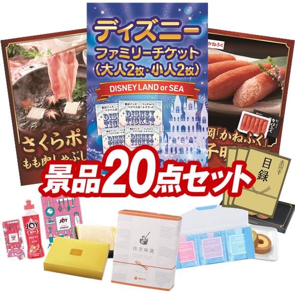 忘年会 景品セット 20点 結婚式二次会 ゴルフコンペ イベント パーティーにも最適!目玉はディズニーファミリーチケット(大人2枚 小人2枚)!