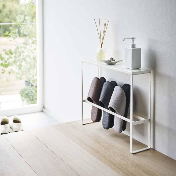 収納が少ない玄関先に、鍵や小物・除菌グッズなども置ける、天板付きスリッパラック。