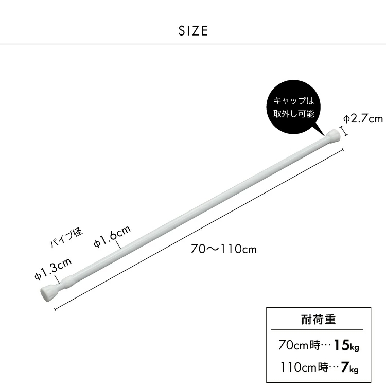 カフェカーテンやちょっとした部屋干しにちょうど良いシンプルなつっぱり棒です。