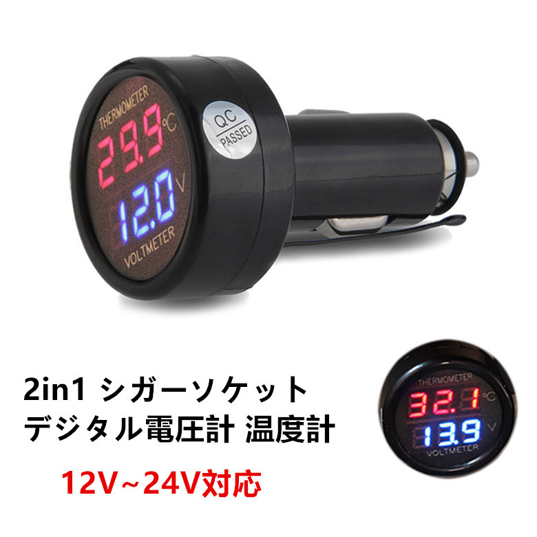 送料無料 便利グッズ 車 2in1 シガーライター式 LEDデジタル 温度計 電圧計 12V〜24V車対応