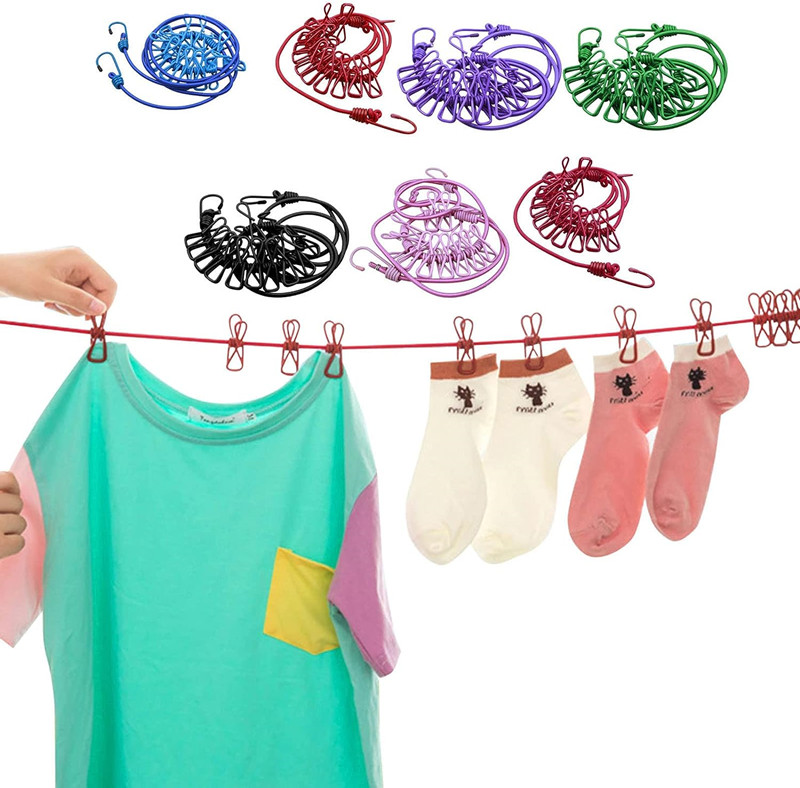 送料無料 洗濯 物干し ロープ 弾力洗濯ロープ 12個クリップ付き ハンガー ストップ 防風 伸縮 携帯便利 旅行用 キャンプ 梅雨 室内物干し