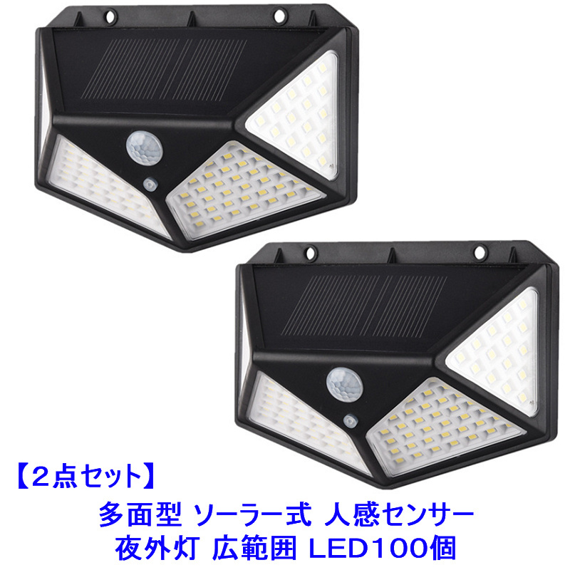 送料無料 お得な2セット 多面型 LED100個 人感センサー式 ソーラーライト 壁掛け 夜外灯 野外灯 屋外センサーライト 電気代不要 自動点灯 高輝度 明るい 防犯