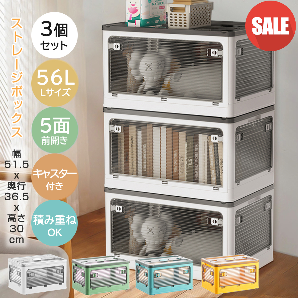 15%OFF 収納ボックス 収納ケース 衣装ケース コンテナボックス 3段 押し入れ クロゼット ストレージボックス 5面開き 折りたたみ キャスター付 3個 L 56L 52L