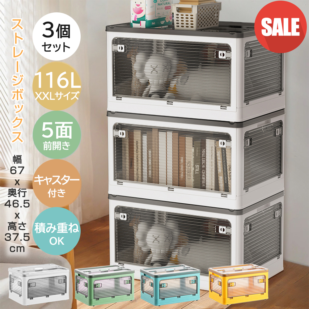 20%OFF 収納ボックス 収納ケース コンテナボックス 衣装ケース カラーボックス ストーレジ 衣類収納 折りたたみ フタ キャスター付 3個 XXL 116L 104L 超大型