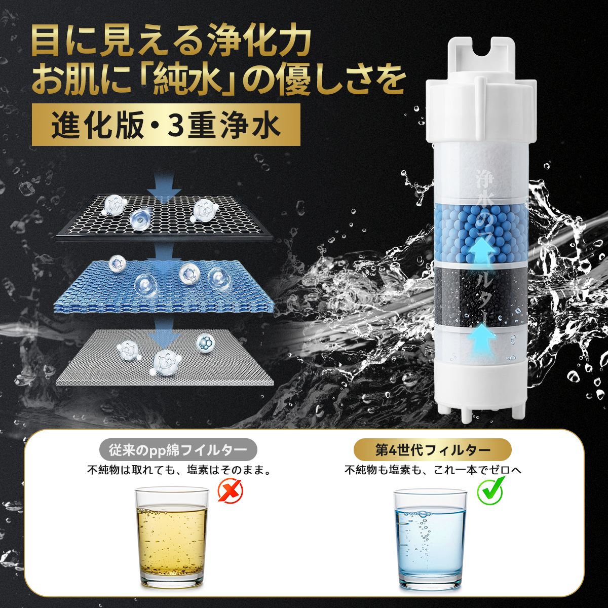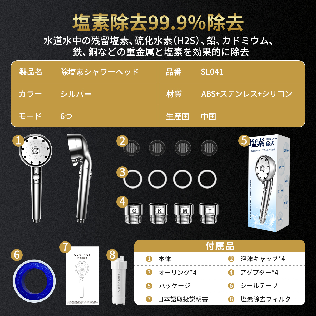 セット内容:シャワーヘッド本体*1、アダプター*4(M・K・G・Tに対応)、塩素除去芯*1本