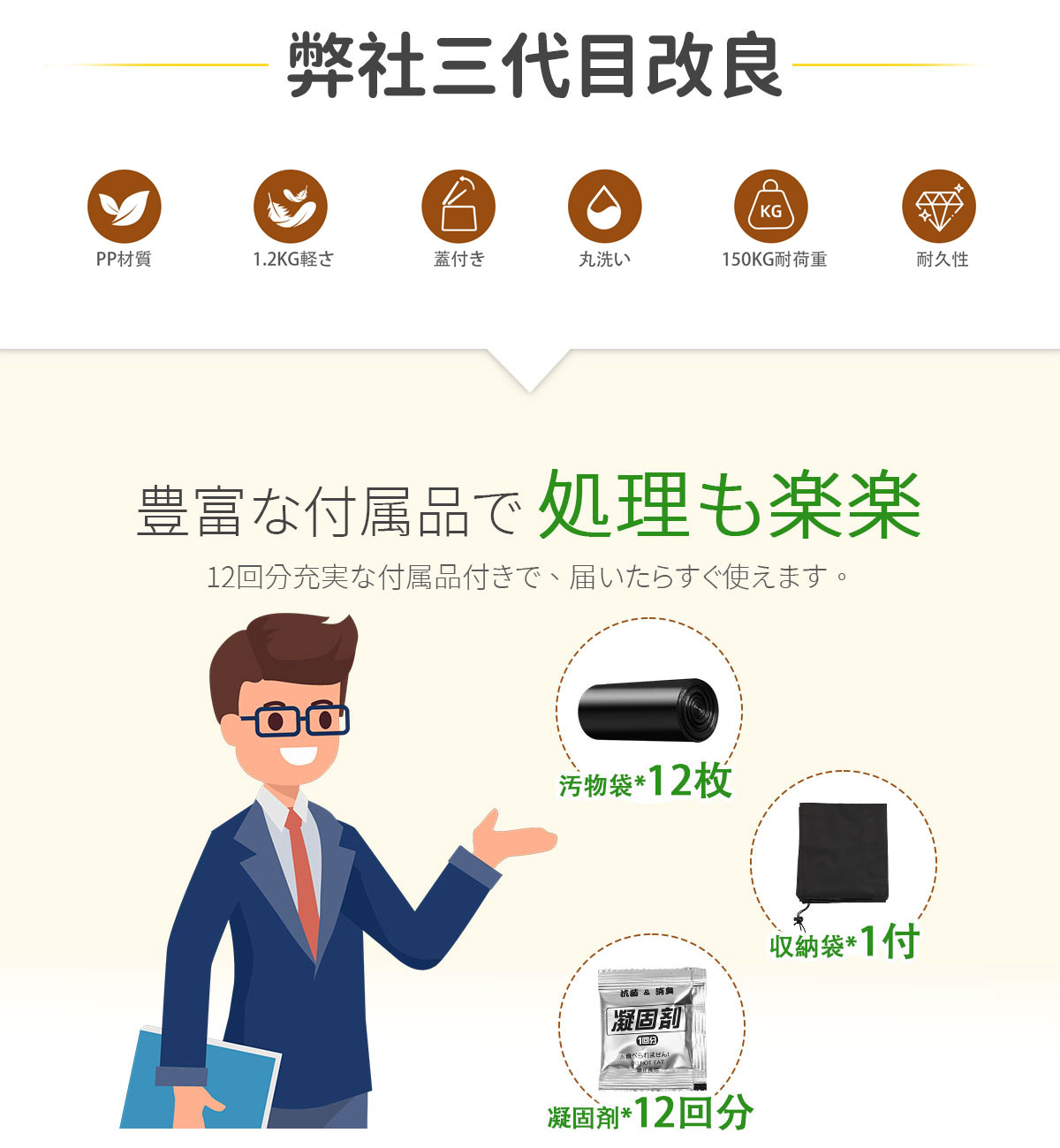 【付属品】凝固剤12個、汚物袋12枚、収納袋1個
