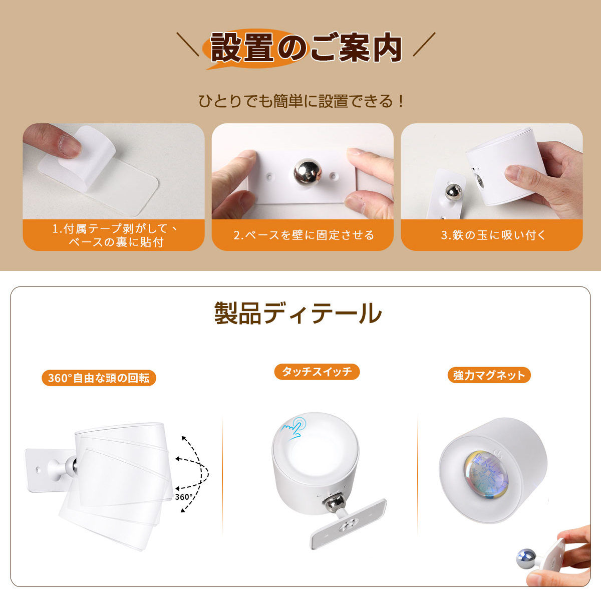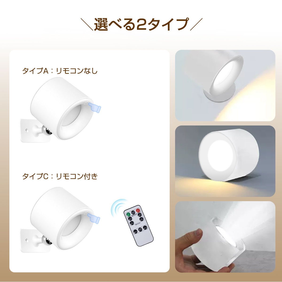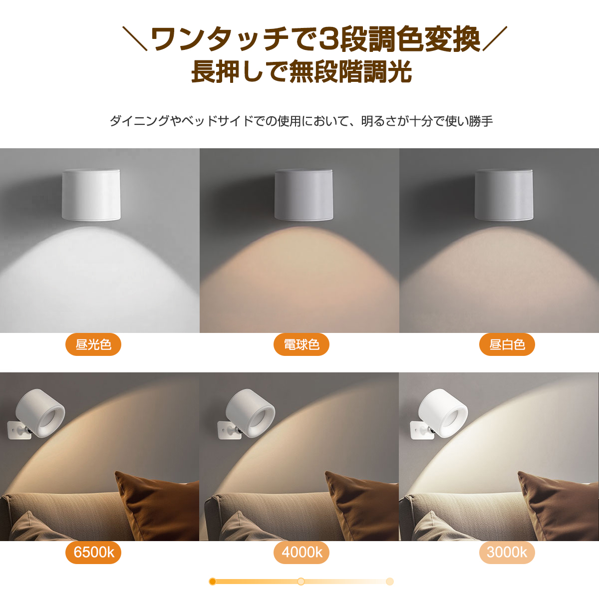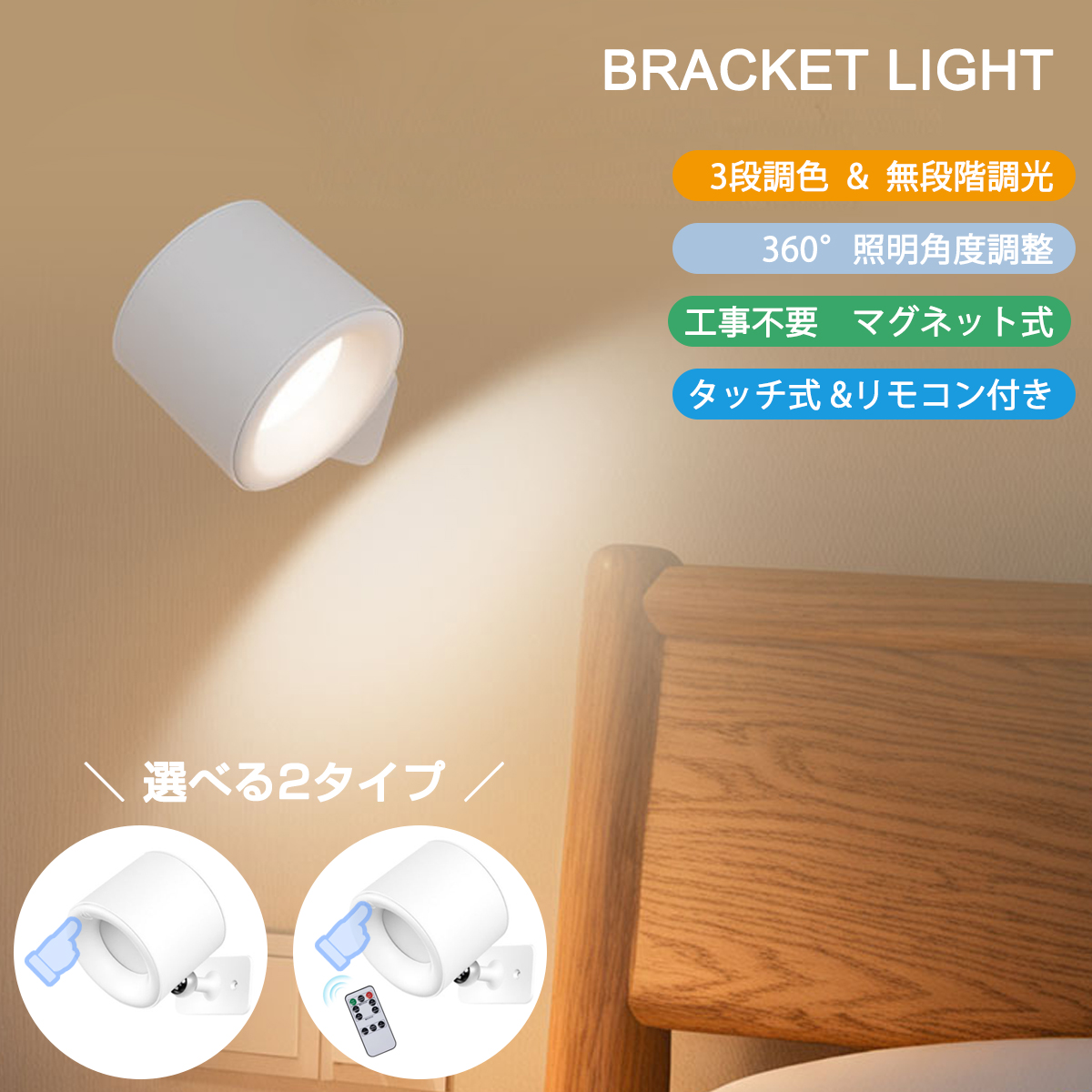 ブラケットライト スポットライト おしゃれ LED 照明 3段調色 無段階調光 360°照明角度調整 卓上 工事不要 Type-C充電 貼り付け タッチ式 リモコン式 2タイプ