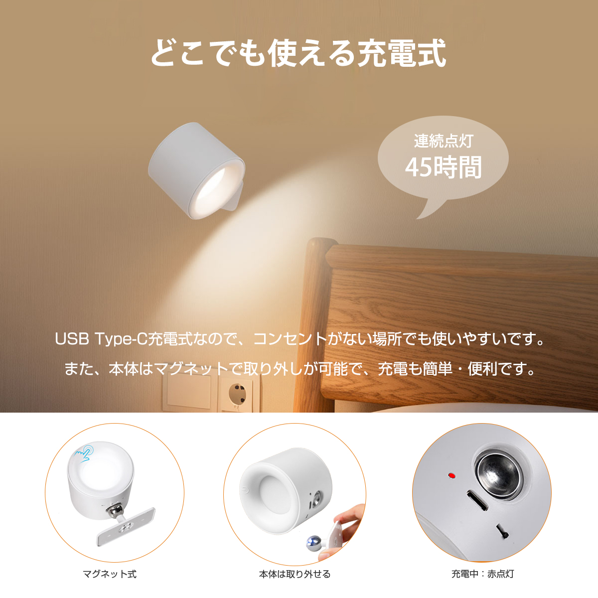 ■本体を取り外せるマグネット式:ブラケットライト本体をベースに吸い付く、ブラケット本体を取り下げて充電可能。