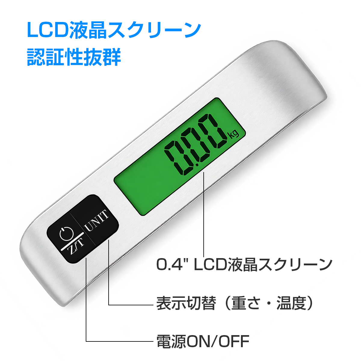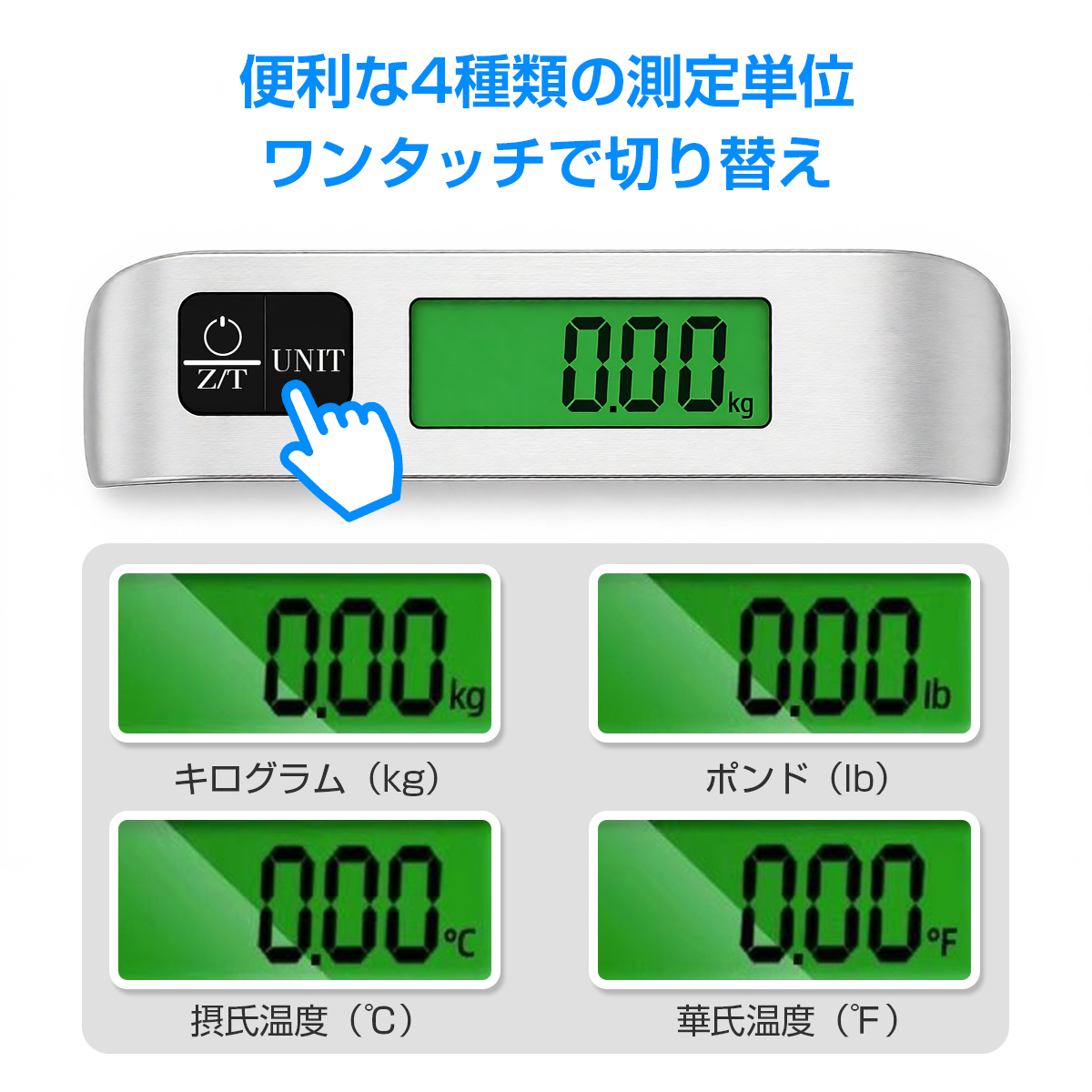 4種類の表示切替測量単位:キログラム(kg)、ポンド(lb)、摂氏温度(℃)、華氏温度(?)