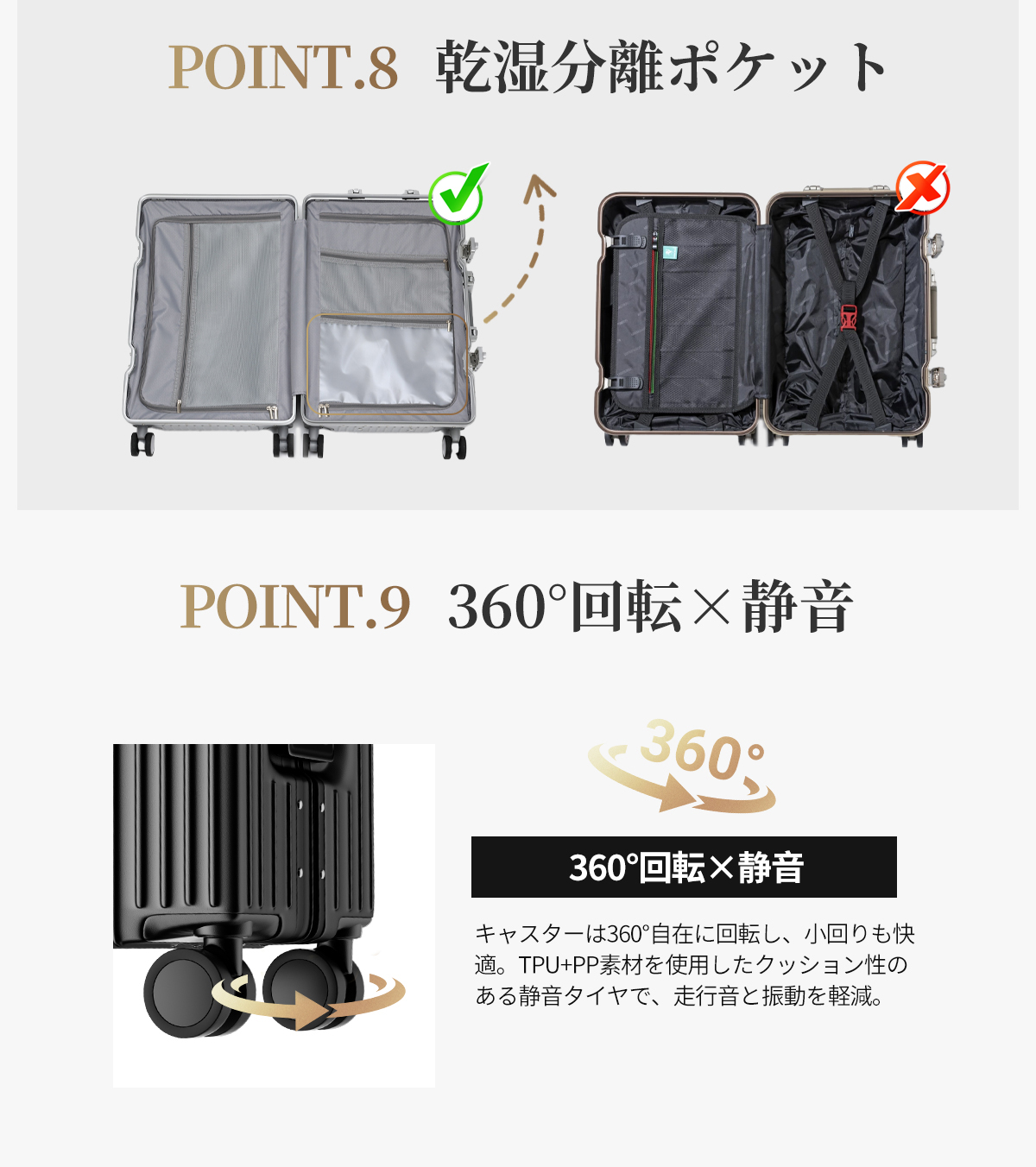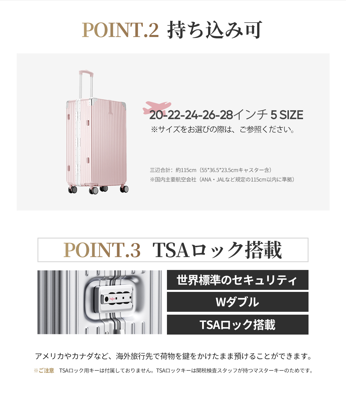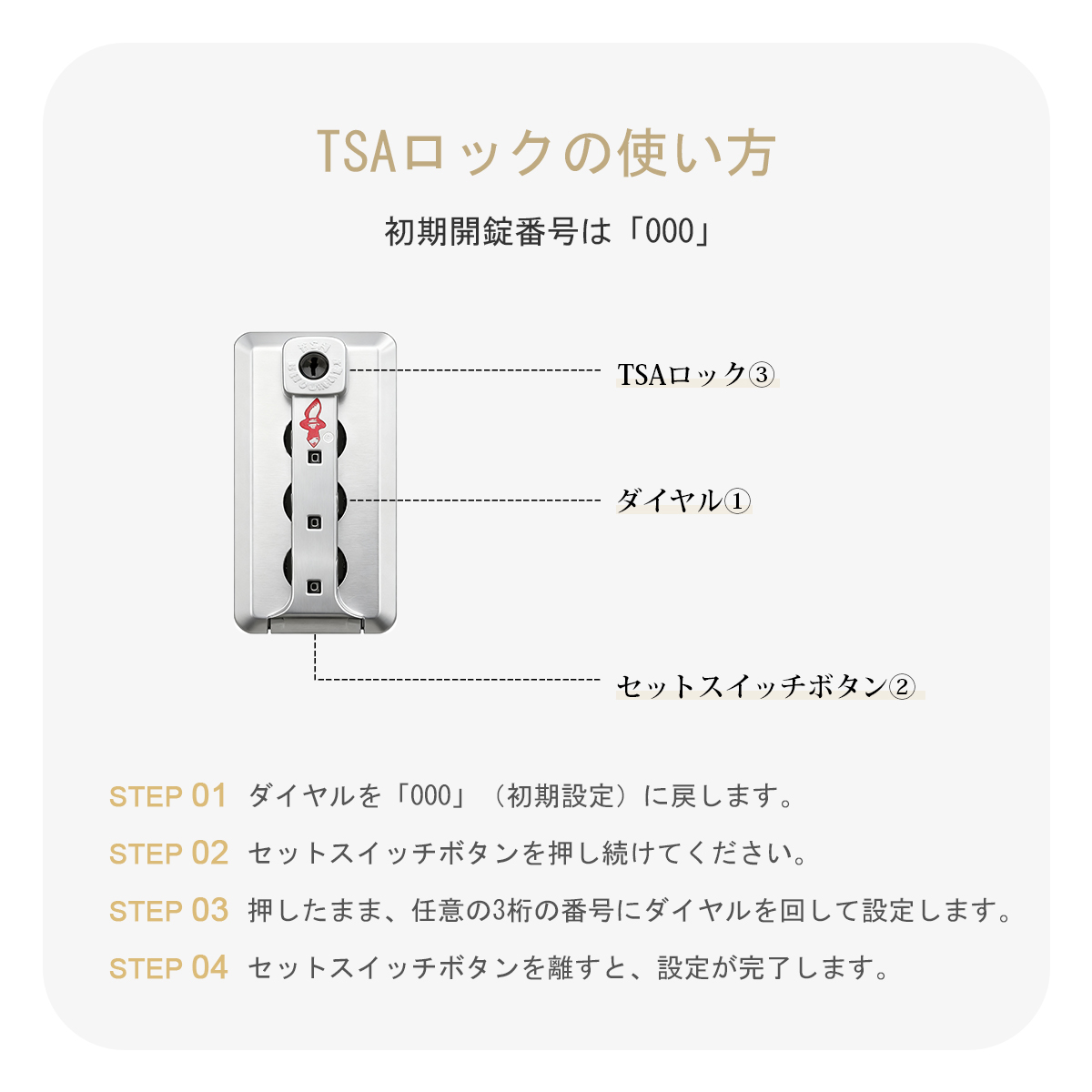 世界基準のTSAロック搭載:ダイアル式ロックタイプです。操作簡単、海外旅行、出張対応。