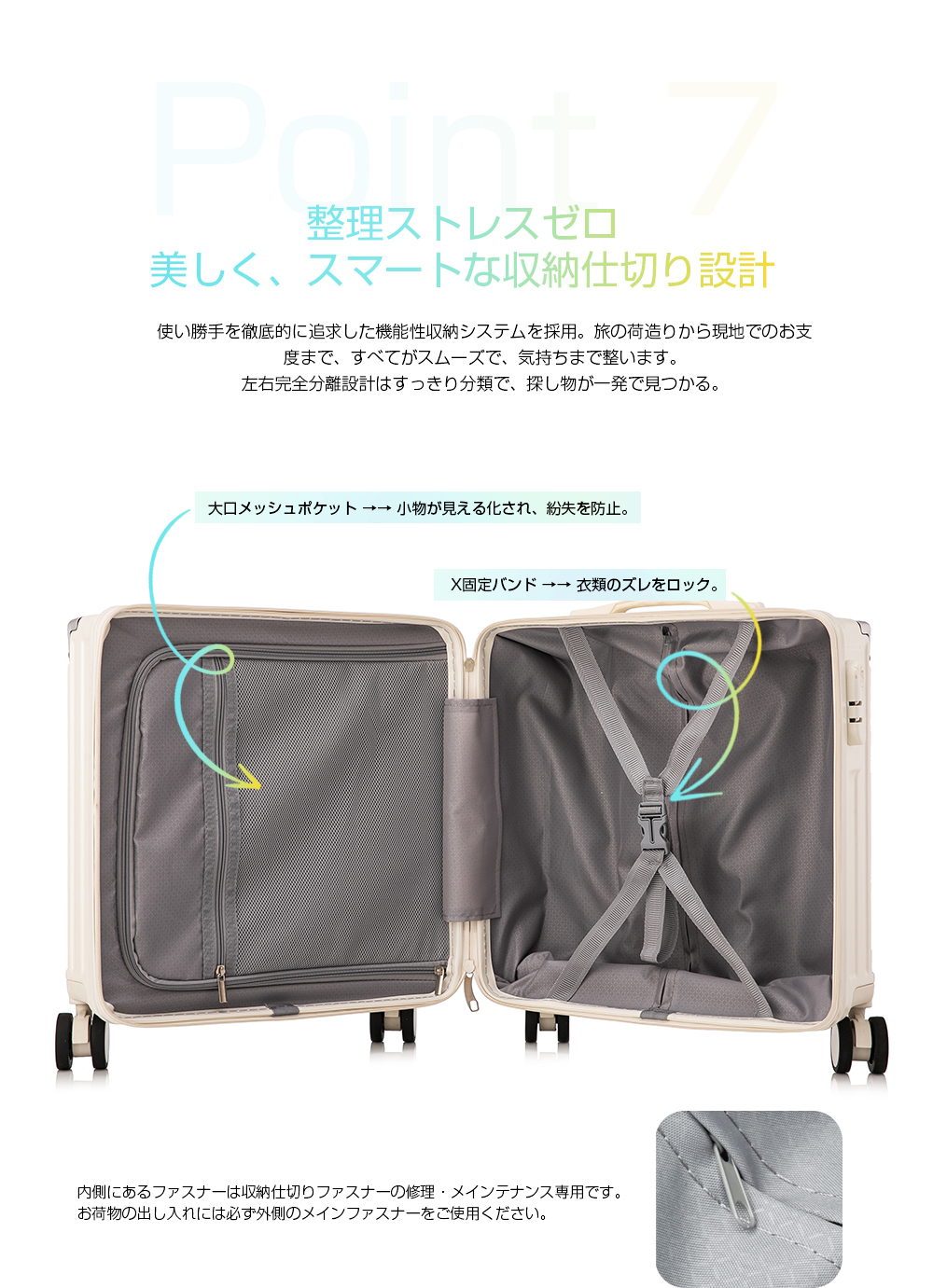 合理的な収納仕切り:メッシュポケット、荷崩れ防止クロスバンドなど