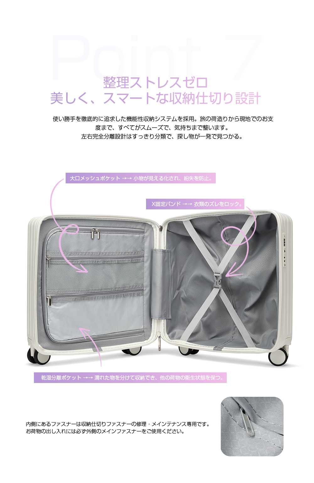 合理的な収納仕切り:乾湿分離ポーチ、メッシュ袋、荷崩れ防止クロスバンドなど