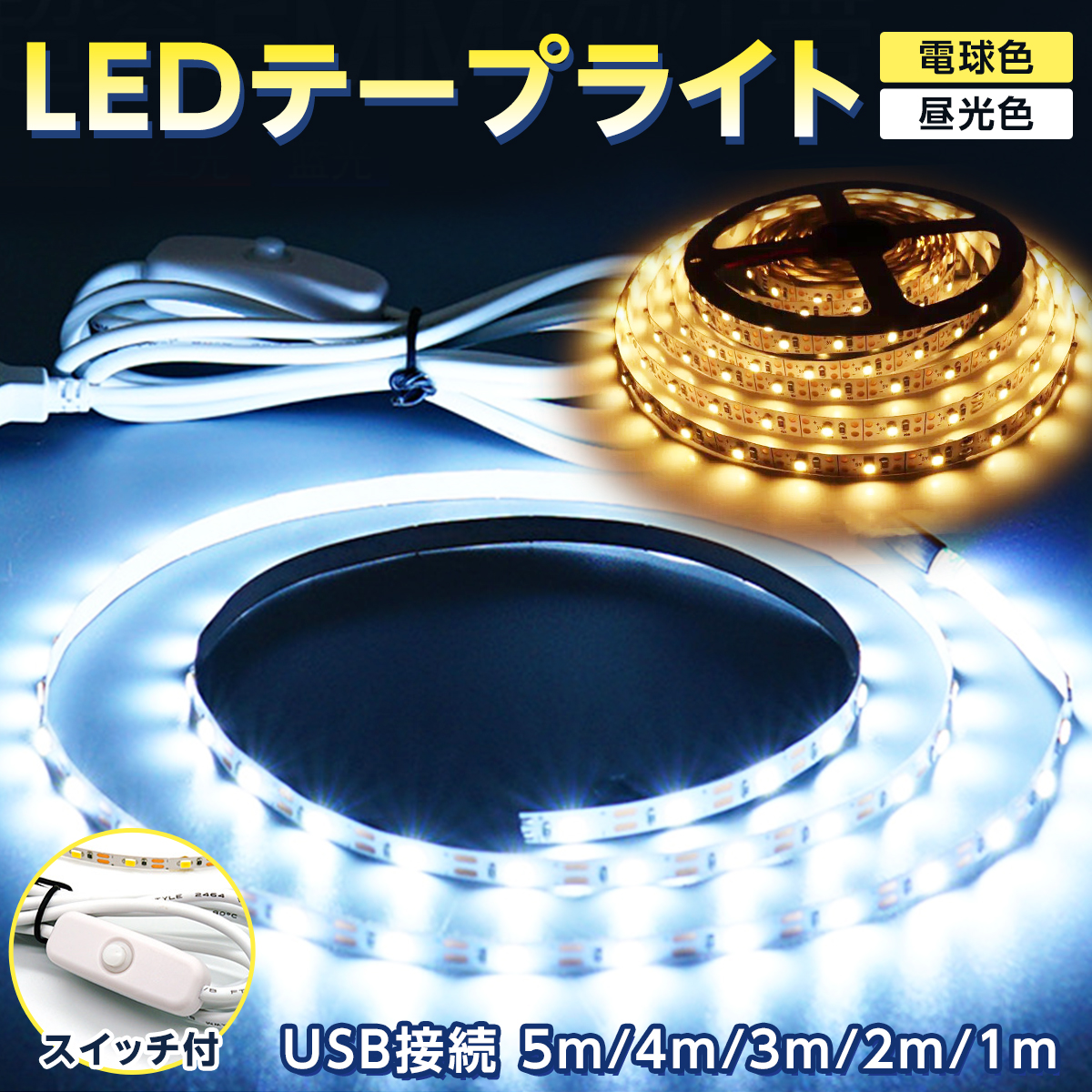 LED テープライト スイッチ付 USB 5m 4m 3m 2m 1m 間接照明 廊下 玄関 車 電球色 昼光色 間接照明 おしゃれ リビング