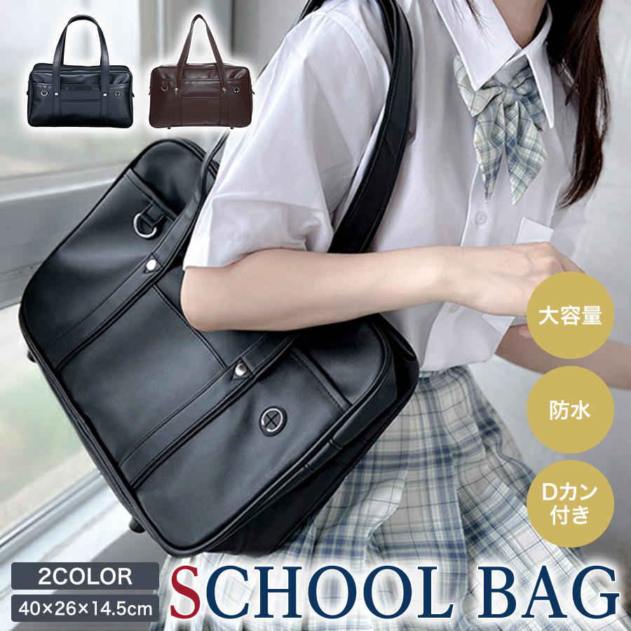 スクールバッグ 合皮 安い 防水 女子 男子 PUレザー 黒 スクバ ボストンバッグ A4 大容量 高校生 中学生 通学 鞄 軽量 無地 男女兼用 撥水 手提げ