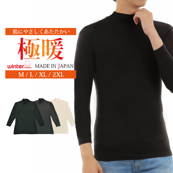 インナー 長袖 メンズ 日本製 極暖 肌着 あたたかい ストレッチ ハイネック オフホワイト ブラック グレー 21FW-0007