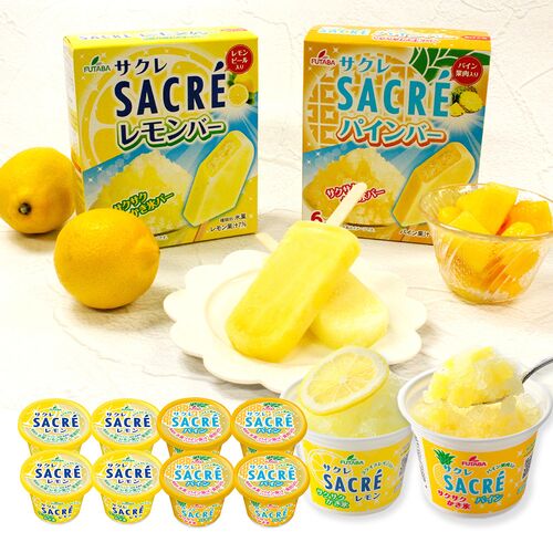 スライスレモン入りで清涼感あふれるかき氷の「サクレレモン」、レモンピール入りでサクレレモンのサクサク食感や爽やかさを再現した「サクレレモンバーマルチ」、ゴロゴロ入った果肉のジューシー感とパインの甘い香りが感じられる「サクレパイン」、サクレパインのジューシーで甘酸っぱい味わいをバータイプにした「サクレパインバーマルチ」。4種類それぞれの味わいを楽しめるセットです。