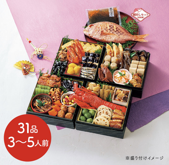 彩り鮮やかな品々で、年に一度のお祝いを賑やかに。豊富な品数を取り揃えました。バラエティー豊かな豪華セット。親族や来客が多く集うご家庭におすすめです。田作り(20g)、丹波黒黒豆(60g)、ふきのうま煮(50g)、里芋含め煮(4個)、富貴ごぼう(50g)、鱈のうま煮(60g)、一口巻昆布(6本)、栗きんとん(100g)、味付しいたけ(5枚)、穂先竹の子(3切)、なます(50g)、酢れんこん(70g)、焼ほたて(4個)、やりいか姿煮(3匹)、くるみ艶煮(35g)、鯛めしセット(焼鯛1尾、鯛めしのだし150g)、だし巻(150g)、手綱こんにゃく(4切)、梅人参(3切)、高野豆腐含め煮(6切)、祝海老(3尾)、イセエビの姿蒸(ミナミイセエビ使用)(1尾)、あさりのうま煮(60g)、若桃甘露煮(5個)、紅白豆マリネ(65g)、白福豆(75g)、紫福豆(珈琲味)(75g)、牛肉ときのこの赤ワイン煮(70g)、照焼つくね(60g)、鶏の照焼(100g)、豚の角煮(65g)■ご注意:産地直送商品の為、手配後のキャンセル致しかねます。他商品との同梱できかねます。ご理解ご承知願います。