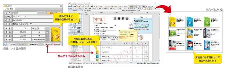 商品画像は、あらかじめ「商品マスタ」に紐付けて管理しますので、明細への流込も簡単に行うことができるほか、明細に利用した画像データは、商品一覧として印刷することも可能です。